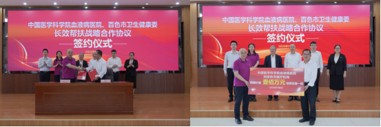 為更好實現長期幫扶,所院與百色市衛生健康委本著“資源共享、優勢互補、互惠互利、共同發展”的原則簽訂戰略合作協議,并向百色市醫療機構捐贈價值100萬元的藥品及遠程醫療設備等物資,旨在進一步提升百色市診療服務能力,助力血液病技術人才培養,最大限度緩解當地就醫難問題,百色市衛生健康委黨組書記、主任黃再波代表百色市衛生健康委簽約。
