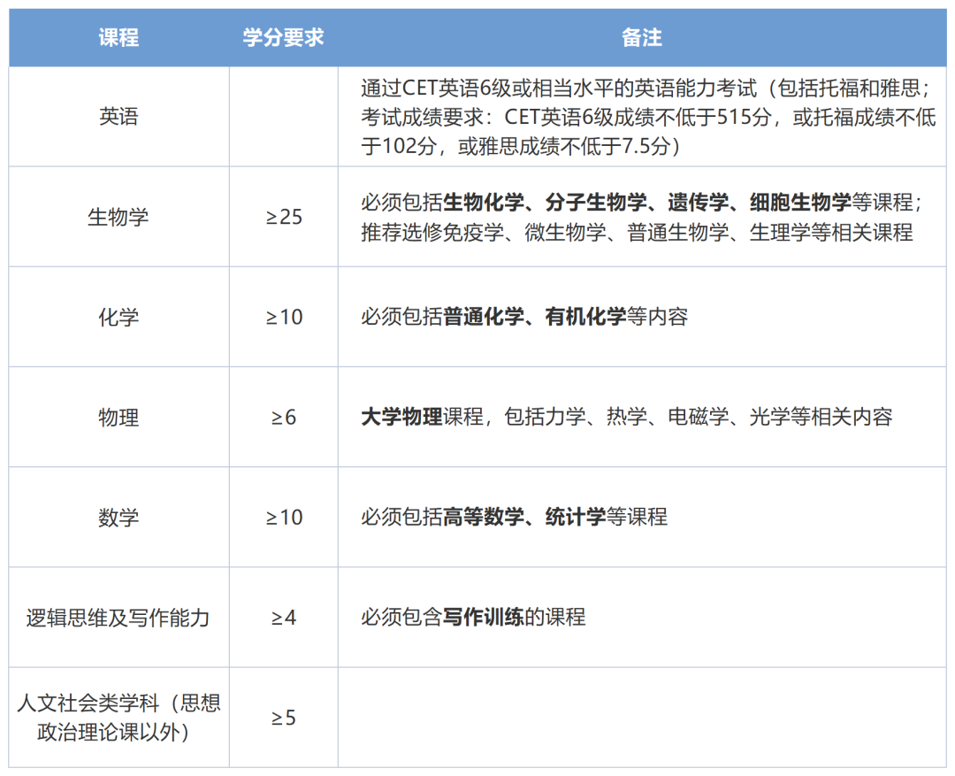 學(xué)生在本科期間修讀的生物、化學(xué)、物理、數(shù)學(xué)、邏輯思維及寫作能力、人文社會類學(xué)科課程必須達(dá)到下表中每項(xiàng)的要求,同時總學(xué)分需要達(dá)到≥70。申請人報名時如未全部完成所規(guī)定的必修課程及學(xué)分,需在申請材料中提供修學(xué)計(jì)劃,并承諾如獲得擬錄取資格將在正式錄取前完成所有必修課程及提供相關(guān)證明材料(網(wǎng)上課程必須包括正規(guī)的結(jié)課學(xué)分證明)。