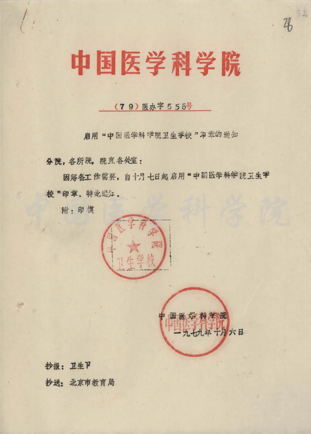 2.啟用“中國醫學科學院衛生學校”印章的通知(8-YJ-1979-YB-6-10-28)
