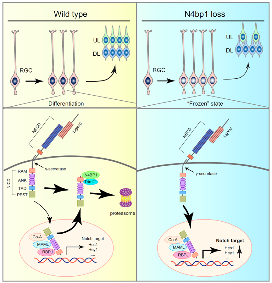 本研究證實N4BP1在大腦皮層發育過程中,具有促進神經前體細胞分化、神經元形成的作用;并且揭示了N4BP1以一種全新的方式調控Notch信號通路,即N4BP1依賴RAM結構域降解NICD,而非通過以往認知的PEST結構域;并且本研究首次揭示E3泛素連接酶Trim21參與Notch信號通路調控,這進一步促進對Notch信號調控網絡的認識。此外,該研究首次報道了CoCUN這種泛素結合結構域的功能,位于N4BP1 C端的CoCUN結構域(特別是862/863位氨基酸構成的“Phe-Pro”模序)是其降解NICD中起關鍵的功能結構。