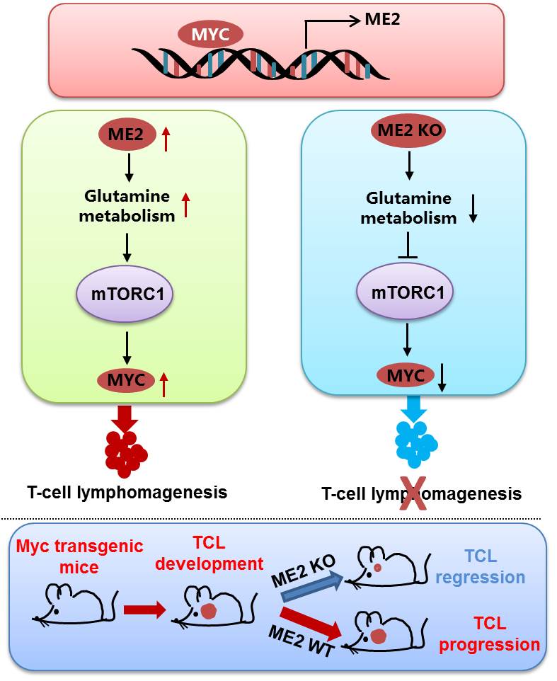 T細胞淋巴瘤(TCL)是一組罕見的、異質性的腫瘤。盡管原癌基因MYC在驅動T細胞淋巴瘤發生方面有重要作用,然而,目前仍不清楚MYC是如何發揮作用促進T細胞淋巴瘤發生的。蘋果酸酶是依賴NADP+(NAD+)的酶,它通過將蘋果酸氧化成丙酮酸和NADPH(NADH)連接谷氨酰胺代謝和葡萄糖代謝。在該研究工作中,本研究團隊首先發現蘋果酸酶2(ME2)在多數T細胞淋巴瘤(TCL)細胞系以及組織中呈現特異性高表達的現象。通過在CD4啟動子的控制下在T細胞中過量表達MYC建立了T細胞淋巴瘤小鼠模型(CD4-Cre;Mycfl/+mice),發現大約90%的小鼠發生TCL,同時也呈現ME2上調表達的現象。有趣的是,在該轉基因小鼠中敲除ME2幾乎完全抑制了小鼠TCL的發生,說明ME2在MYC驅使的TCL中具有重要作用。為了弄清楚ME2在MYC驅動的TCL中的作用,研究人員分別進行了體內及體外的分子機制研究。發現MYC可以上調ME2的表達,通過ME2介導的谷氨酰胺代謝維持細胞內的氧化還原平衡,從而促進T細胞淋巴瘤產生;反過來,ME2通過調節谷氨酰胺代謝刺激mTORC1活性,從而促進MYC蛋白的翻譯;揭示了在谷氨酰胺代謝和TCL的氧化還原維持中ME2和MYC之間存在一種正反饋調節環路最后研究人員發現利用雷帕霉素(mTORC1抑制劑)處理小鼠可以有效阻斷小鼠TCL的發展。