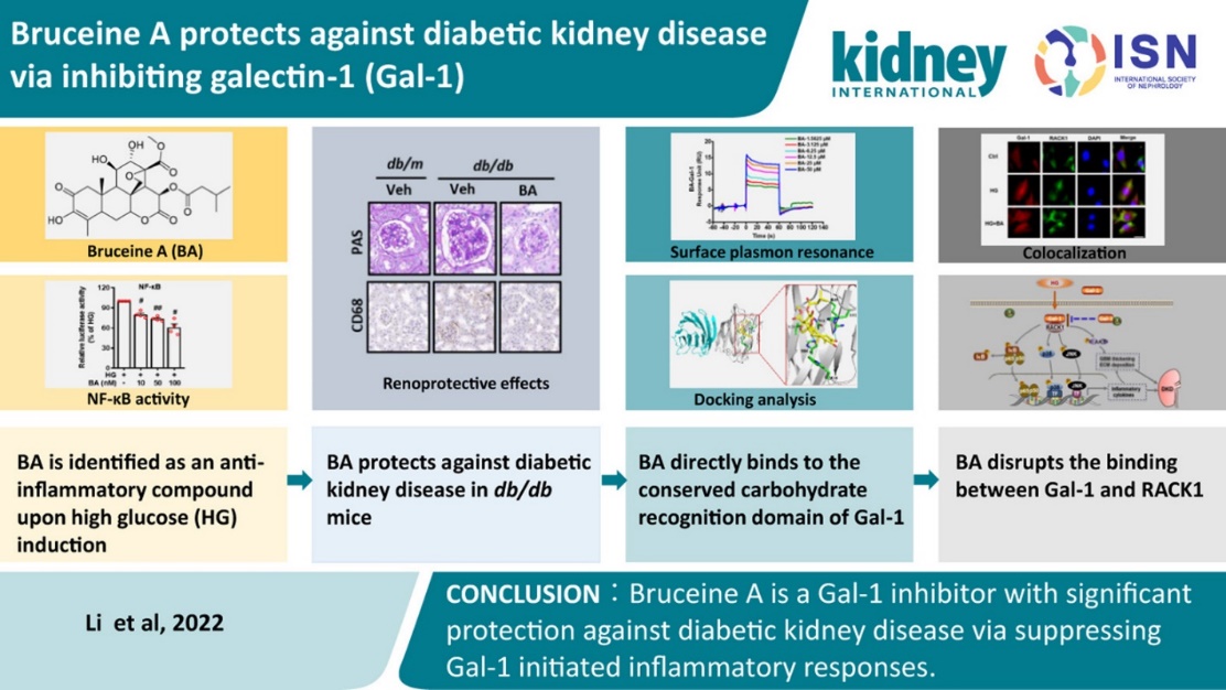 2022年5月19日,中國醫(yī)學(xué)科學(xué)院醫(yī)藥生物技術(shù)研究所王真團(tuán)隊在腎臟病研究領(lǐng)域權(quán)威雜志Kidney International在線發(fā)表了題為“Bruceine A protects against diabetic kidney disease via inhibiting galectin-1”的研究論文。該研究發(fā)現(xiàn)提取自中藥鴉膽子的苦木素類單體鴉膽子素A具有良好的體外抗炎作用及體內(nèi)抗炎和抗糖尿病腎病的保護(hù)作用。