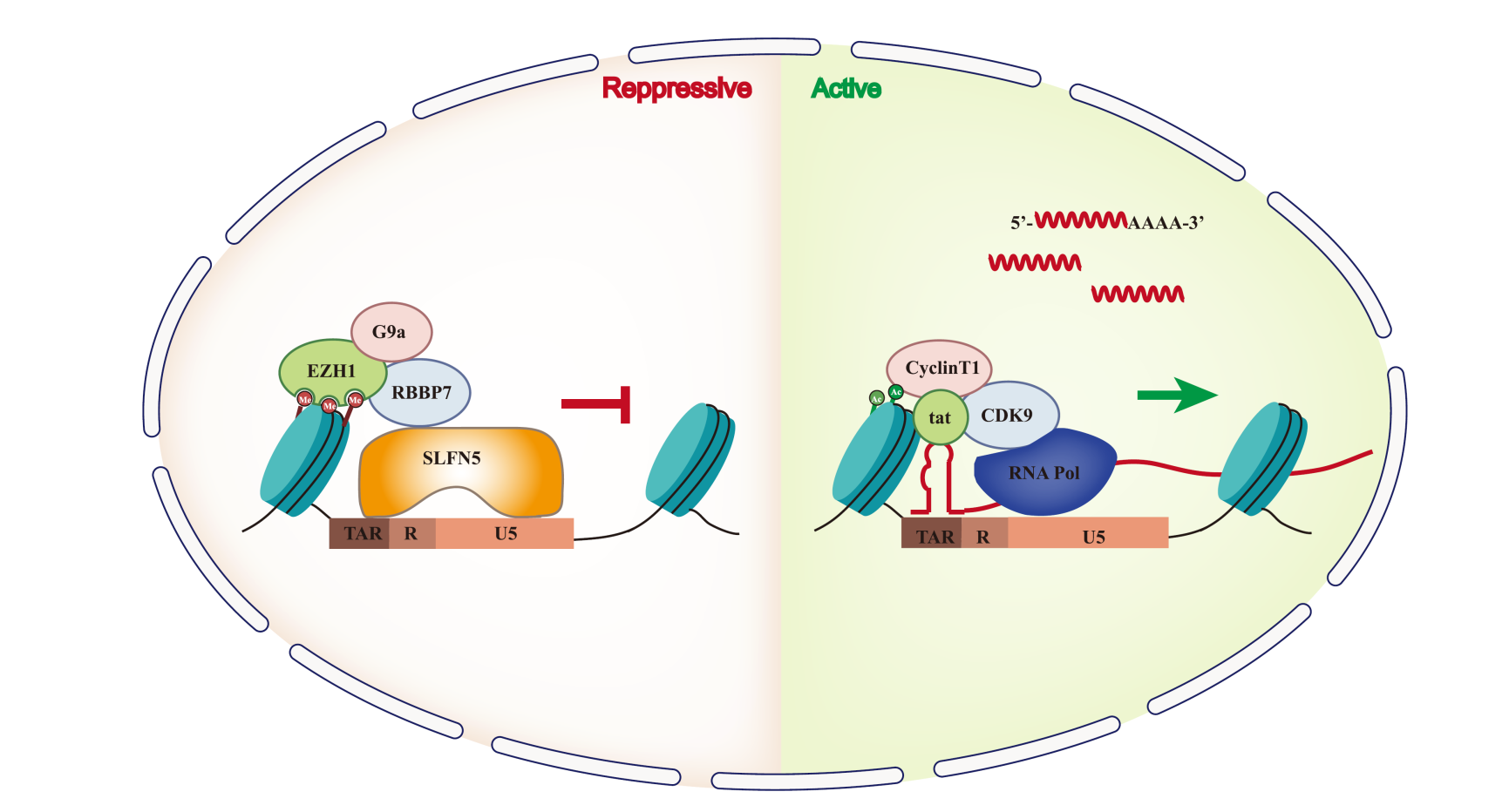 Schlafen-5(SLFN5)是干擾素誘導的Schlafen家族蛋白成員之一,參與免疫反應和腫瘤發生等生物學功能。本研究團隊發現了SLFN5的表達水平與艾滋病病毒(HIV-1)的復制密切相關。實驗表明,SLFN5可以識別HIV-1的啟動子區,顯著降低HIV-1長端重復序列(LTR)的轉錄活性,從而抑制RNA聚合酶II在轉錄起始點的募集。進一步研究發現,SLFN5與PRC2復合體的成分G9a以及組蛋白H3相互作用,促進組蛋白H3第27位賴氨酸殘基的二甲基化和三甲基化(H3K27me2、H3K27me3)的修飾,從而抑制HIV-1的轉錄,阻止潛伏的HIV-1的激活。上述研究提示SLFN5是一種固有免疫效應分子,是機體對病毒感染的控制機制之一。