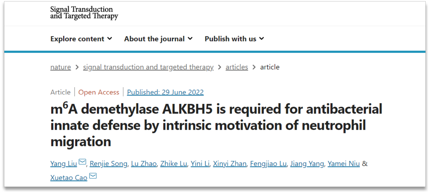 2022年6月29日,中國醫學科學院基礎醫學研究所暨中國醫學科學院免疫治療研究中心曹雪濤院士團隊在Signal Transduction and Targeted Therapy雜志發表了題為“m6A demethylase ALKBH5 is required for antibacterial innate defense by intrinsic motivation of neutrophil migration”的研究論文。研究報道了alkB同源物5 RNA去甲基化酶(alkB homolog 5 RNA demethylase,ALKBH5)在機體抗菌免疫防御過程中發揮著至關重要的作用,首次揭示了中性粒細胞ALKBH5及N6-甲基腺嘌呤(N6-methyladenosine,m6A)RNA修飾可以調控其遷移能力的表觀新機制。