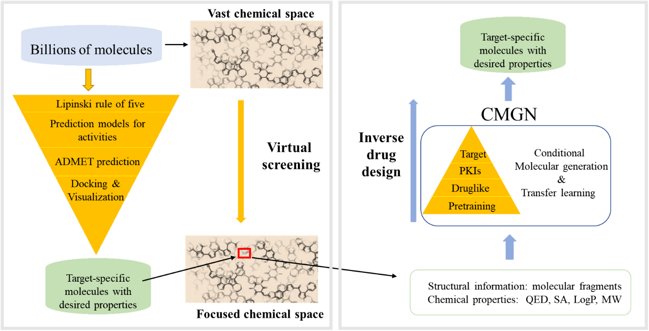 圖1. CMGN與傳統藥物設計對比,及其通過遷移學習及性質調節解決分子逆問題的應用策略