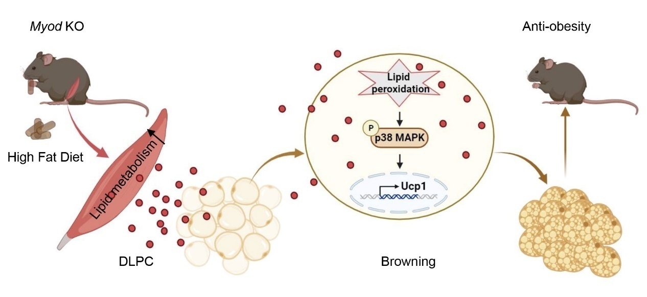 圖1. MyoD調控骨骼肌分泌的DLPC經血液到達白色脂肪后通過脂質過氧化激活p38誘導iWAT棕色化并協調全身能量穩態。