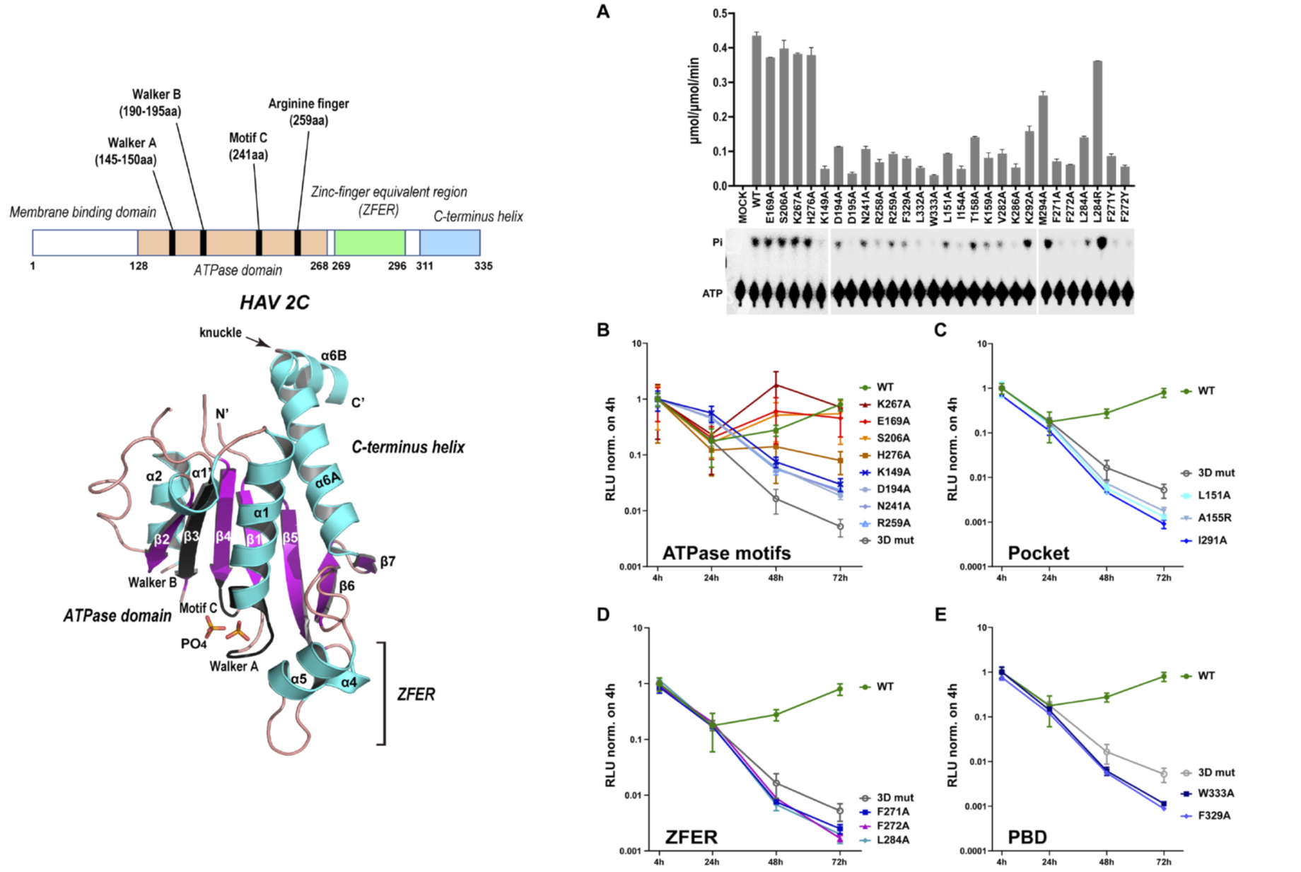 圖. HAV 2C的晶體結(jié)構(gòu)、保守結(jié)構(gòu)域及其在ATP酶活性、病毒復(fù)制中的作用