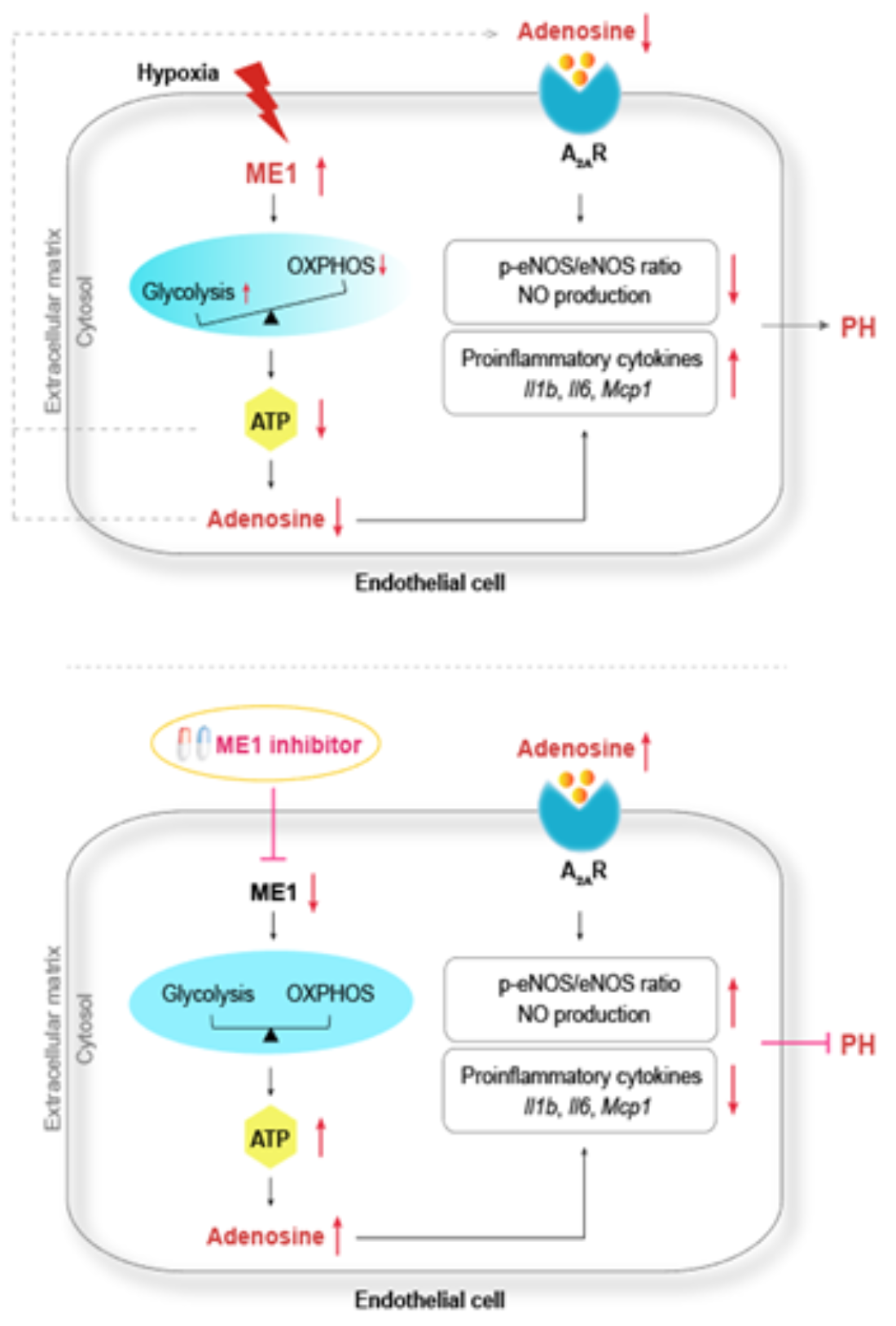 2024年2月5日,中國醫學科學院基礎醫學研究所王辰、王婧團隊和杜文靜團隊合作在Circulation《循環》發表了“Inactivation of malic enzyme 1 in endothelial cells alleviates pulmonary hypertension”(抑制內皮細胞中蘋果酸酶1活性可減輕肺動脈高壓)的論文。研究報道了蘋果酸酶1(Malicenzyme 1, ME1)在肺動脈高壓(Pulmonary Hypertension, PH)發生發展中的作用,確定了ME1影響內皮細胞腺苷代謝導致PH的新機制,并明確了ME1抑制劑在PH干預中的潛在價值。