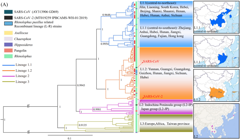 圖2. 蝙蝠Sarbecovirus亞屬冠狀病毒分布及系統分化圖