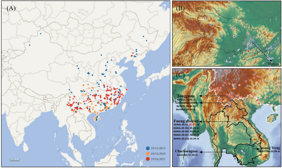 本文指出,我國境內菊頭蝠種群中SARS-CoV-2相關冠狀病毒(SC2r-CoV)的循環非常有限,需要在現有邊境采樣點的更南部和東南亞地區開展研究,來探索與SARS-CoV和SARS-CoV-2關聯性更高的動物冠狀病毒多樣性,進一步尋找其直接祖先。同時,應該進一步加強蝙蝠攜帶重組冠狀病毒的監測,來預警未來新發傳染病的發生。目前國際權威機構發現中南半島地區蝙蝠攜帶與SARS-CoV-2同源性更高的SC2r-CoV(Temmam et al. Nature. 2022),這個結果驗證了本研究的結論和推測。