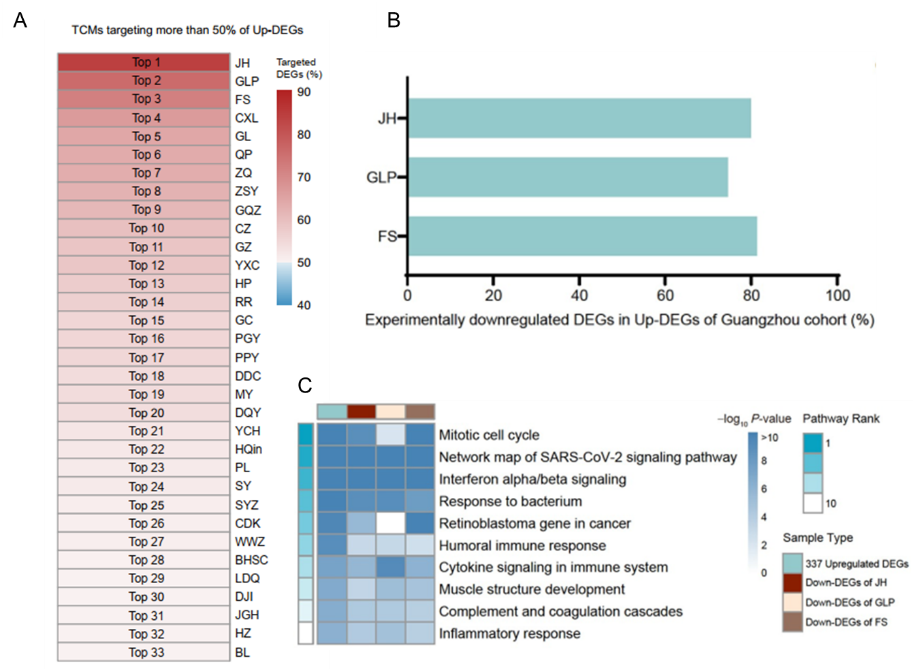 A.33種靶向50%以上新冠上調基因的中藥飲片。B, C.橘紅、瓜蔞皮、佛手中sRNA基因表達調節作用。