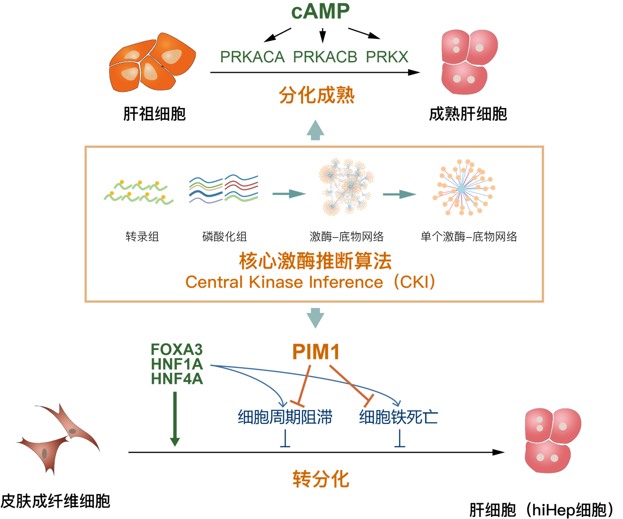 肝細胞在藥物評價、細胞治療、生物人工器官等領域具有重要的應用價值。然而,如何高效獲取具有成熟功能的肝細胞一直是瓶頸問題。本研究團隊基于CKI算法預測出PIM1是肝向轉分化的關鍵調控激酶(圖一)。進一步研究發現過表達PIM1可以抑制細胞命運轉變導致的細胞周期阻滯和細胞鐵死亡,從而大幅提高肝向轉分化的效率,并能顯著促進轉分化肝細胞的成熟。這項工作利用CKI算法也發現了雙分化潛能的小鼠肝祖細胞在向成熟肝細胞分化過程中,環磷酸腺苷(cAMP)通過蛋白激酶C的激酶活性亞基(?亞基、?亞基)、X-連鎖蛋白激酶等促進肝細胞成熟的機制。該項研究不僅為更高效地獲取成熟的轉分化肝細胞提供了關鍵的機制基礎,也為多組學整合的重要激酶預測提供了高效的計算方法。