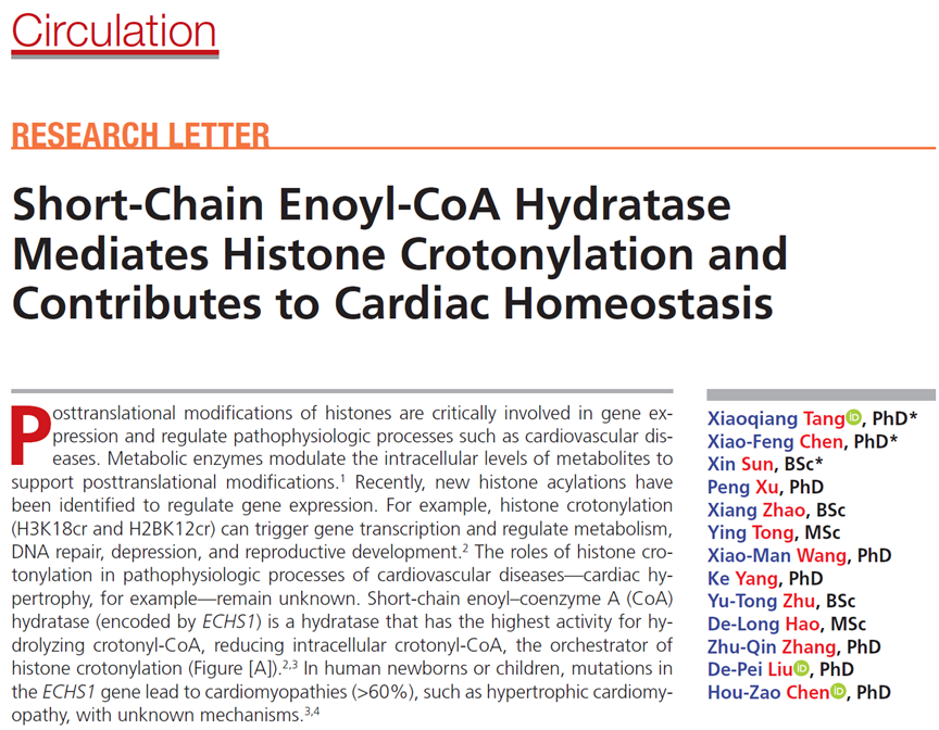 2021年3月9日,中國醫(yī)學(xué)科學(xué)院基礎(chǔ)醫(yī)學(xué)研究所劉德培團(tuán)隊在Circulation上發(fā)表題為“Short-chain Enoyl-CoA Hydratase Mediates Histone Crotonylationand Contributes to Cardiac Homeostasis”的論文,研究發(fā)現(xiàn)Short-chain Enoyl-CoA Hydratase(ECHS1)在心臟中通過調(diào)控巴豆酰輔酶A水平維持心肌細(xì)胞穩(wěn)態(tài),首次揭示組蛋白巴豆酰化修飾在心肌肥厚等心血管疾病中發(fā)揮的病理生理作用。
