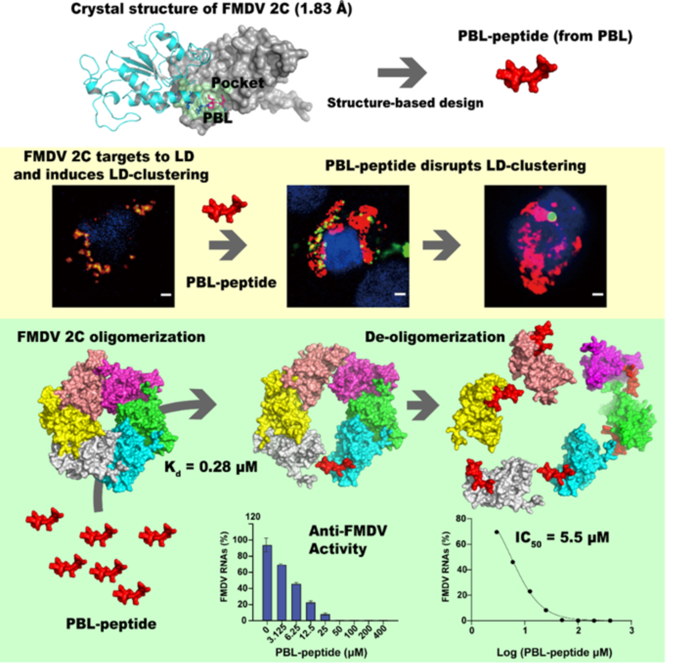 本團隊研究人員首次解析了FMDV 2C高分辨率晶體結構,基于結構設計了一種抗病毒多肽(PBL-peptide)。并發現PBL-peptide能夠解離2C多聚體、抑制其ATP酶活性;證明PBL-peptide與靶點具有較高親和力(納摩爾水平),能夠破壞2C誘導的脂滴(LD)聚集。最后,研究人員還在體外活性實驗,細胞模型和乳鼠模型中系統評價了PBL-peptide的抗病毒活性。PBL-peptide的設計和應用已申請國際專利。