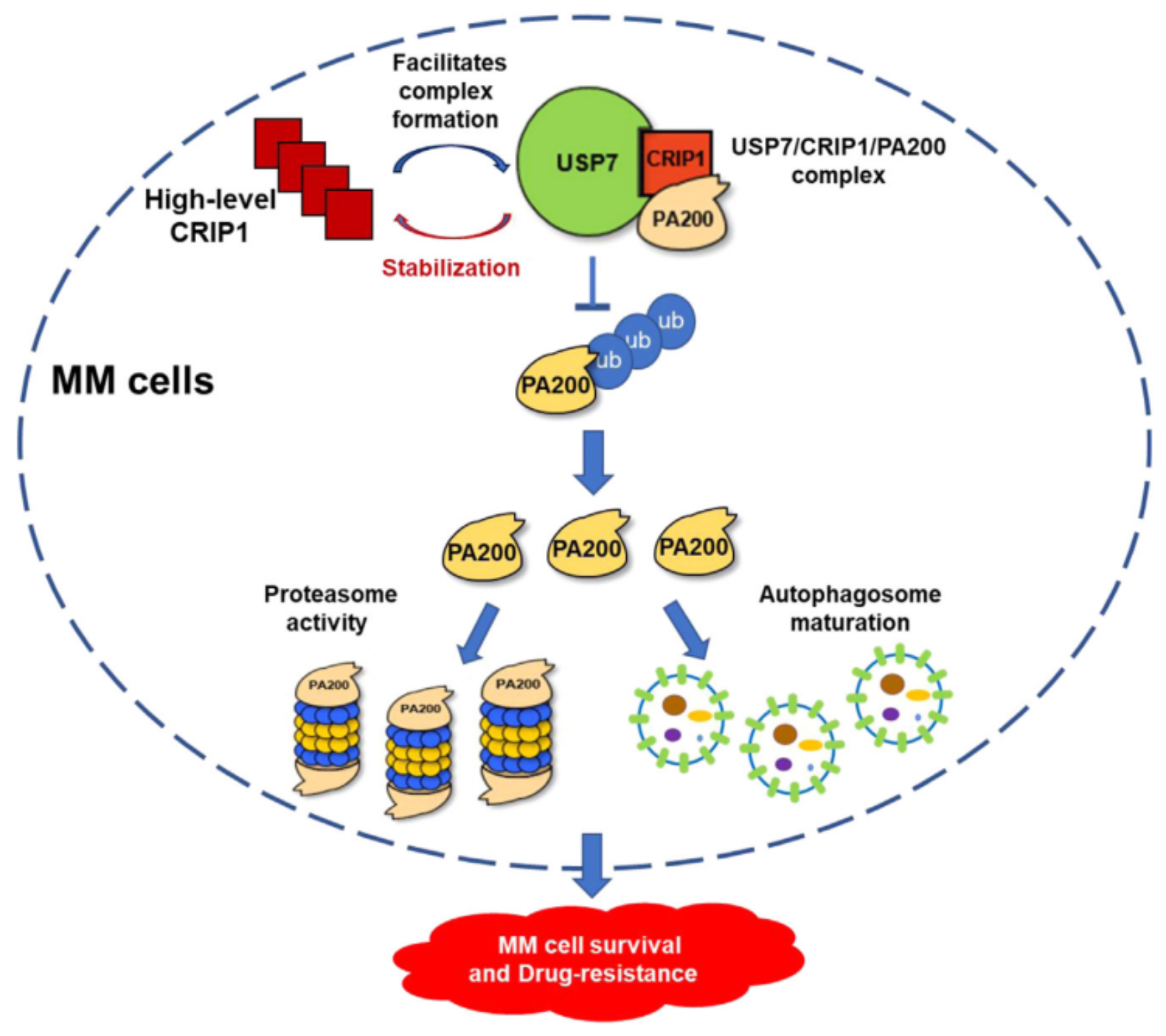 該研究發(fā)現(xiàn)CRIP1在MM細胞,尤其是復發(fā)/難治性MM細胞中表達升高,且MM細胞中CRIP1高表達與患者不良預后顯著相關(guān)。CRIP1基因敲除顯著抑制了MM細胞的生長、侵襲和遷移,增加MM細胞對PIs誘導的細胞生長阻滯的敏感性,同時基因敲除的MM細胞蛋白酶體活性和自噬活性均顯著降低。通過蛋白質(zhì)譜和Co-IP分析,發(fā)現(xiàn)CRIP1可與去泛素化酶USP7及蛋白酶體亞基PA200形成復合物,一方面穩(wěn)定CRIP1在MM細胞內(nèi)高水平表達,另一方面有利于USP7與PA200的相互作用,促進USP7介導的PA200去泛素化并增強其穩(wěn)定性,從而促進MM細胞的存活和耐藥。此外,在CRIP1過表達的MM細胞系中分別敲低USP7或PA200基因,會顯著抑制MM細胞蛋白酶體活性以及自噬活性,從而增強MM細胞對PIs的敏感性。綜上,該研究首次揭示支架蛋白CRIP1通過多途徑調(diào)控多發(fā)性骨髓瘤細胞蛋白質(zhì)穩(wěn)態(tài),促進腫瘤細胞耐藥性的產(chǎn)生和疾病進展,為發(fā)現(xiàn)潛在治療靶點提供理論依據(jù)。