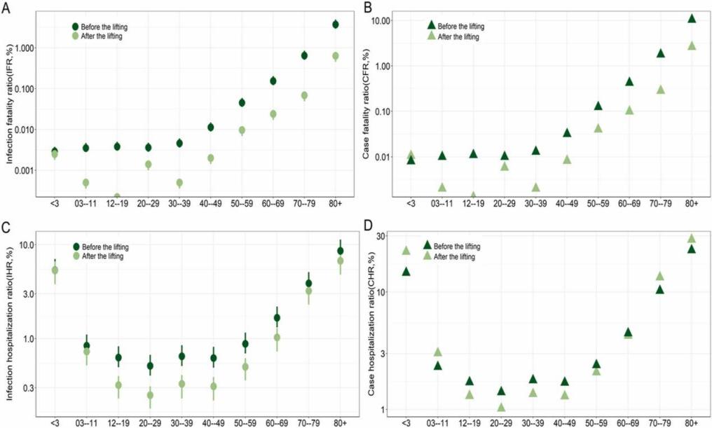 20225香港開始逐步放松核酸檢測和隔離措施,研究通過模型開發(fā)擬合20221月至202210香港的新冠感染數(shù)據(jù)綜合考慮核酸檢測和隔離措施、第一針第二針以及加強針疫苗接種、接種免疫力隨時間下降以及疾病嚴重程度的作用估算了期間未確診或者確診未上報的新冠感染患者,評估放松措施前后的全年齡組以及年齡別IFRIHR