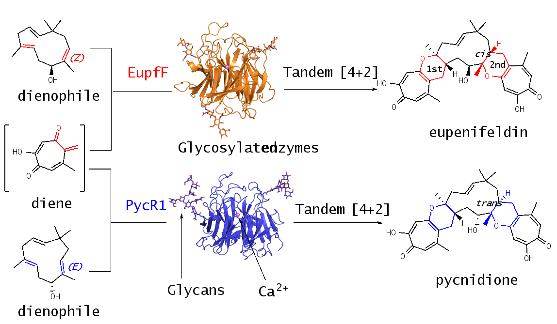 蛋白質(zhì)糖基化會影響蛋白質(zhì)正確折疊、分泌、亞基的聚合和信號轉(zhuǎn)導(dǎo)等,從而在很多生物過程中發(fā)揮重要作用。然而,目前關(guān)于糖基化對生物合成酶催化功能的影響還不清楚。該論文報道了糖基化蛋白EupfF及其同源蛋白PycR1分別催化串聯(lián)[4+2]環(huán)化反應(yīng),參與強(qiáng)效抗腫瘤天然產(chǎn)物eupenifeldinpycnidione的生物合成。這兩個分子是分別由制藥公司百時美施寶和默克從真菌中發(fā)現(xiàn)的納摩爾級抗腫瘤天然產(chǎn)物,因其復(fù)雜的化學(xué)結(jié)構(gòu)和連續(xù)的手性中心,使其化學(xué)全合成一直未被攻破。