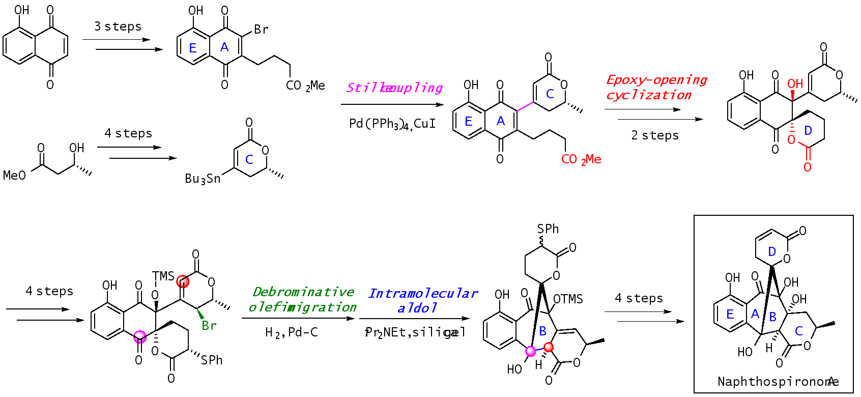 研究團(tuán)隊(duì)經(jīng)過巧妙設(shè)計(jì),以商品試劑胡桃醌和(R)-3-羥基丁酸甲酯為起始原料,通過Stille偶聯(lián)使用會(huì)聚式合成路線導(dǎo)入了天然產(chǎn)物的全部碳原子,再經(jīng)過酸介導(dǎo)的環(huán)氧開環(huán)螺環(huán)化構(gòu)建D環(huán),利用還原脫溴引發(fā)雙鍵遷移及堿誘導(dǎo)的分子內(nèi)羥醛縮合成功實(shí)現(xiàn)了籠狀核心骨架螺[二環(huán)[3.2.1]辛烷-吡喃]環(huán)系的構(gòu)筑,最終以17步最長(zhǎng)線性步驟序列完成了Naphthospironone A的首次全合成。根據(jù)合成樣品和文獻(xiàn)報(bào)道旋光值的比對(duì),也確證了此天然產(chǎn)物的絕對(duì)構(gòu)型。該研究工作不僅為后續(xù)藥理活性篩選及成藥性研究奠定了堅(jiān)實(shí)的基礎(chǔ),而且為該類復(fù)雜天然產(chǎn)物的合成提供了良好的方法和借鑒。