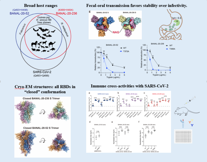 2023年7月28日,中國醫學科學院病原生物學研究所錢朝暉團隊和中國科學院生物物理研究所王祥喜團隊合作在Cell Discovery《自然發現》期刊上發表了題為“Host susceptibility and structural and immunological insight of S proteins of two SARS-CoV-2 closely related bat coronaviruses”(兩種新冠樣蝙蝠冠狀病毒S蛋白的宿主易感性、結構以及免疫學研究)的研究論文,對2種于2020年在老撾發現的、與SARS-CoV-2高度同源的蝙蝠冠狀病毒BANAL-20-52和BANAL-20-236 S的潛在宿主范圍、S蛋白的結構以及免疫特征進行了較系統的研究。