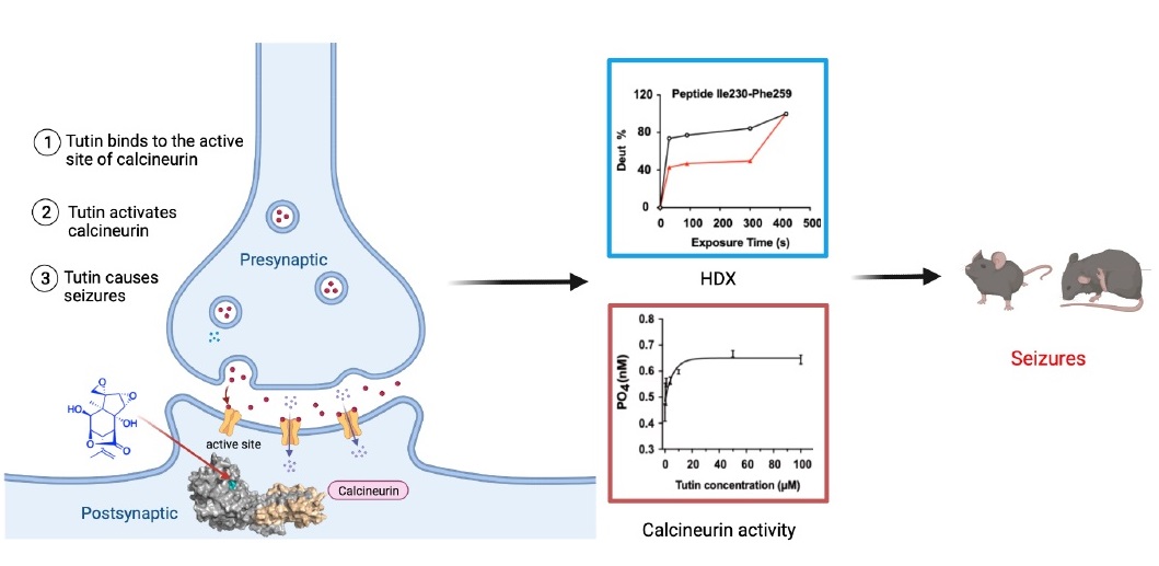 研究團隊長期聚焦于有毒天然產物的研究,在此研究中團隊首次使用熱蛋白質組分析法(Thermal protein profiling, TPP),在原代培養神經元上發現鈣調神經磷酸酶(Calcineurin, CN)是羥基馬桑毒素致癲癇的關鍵靶標蛋白,并通過多種分子生物學和生物物理實驗技術證實羥基馬桑毒素與CN催化亞基的活性位點結合。研究結果顯示羥基馬桑毒素在體內外實驗中均可激活CN。行為學和腦電結果表明,抑制CN可降低癲癇發作強度,而且能顯著減輕致癲癇過程中的小鼠皮層和海馬神經元損傷。此外,機制研究發現NMDA受體、GABA受體和BK通道可能也參與了羥基馬桑毒素致癲癇的過程。該論文充分揭示了羥基馬桑毒素作用機制和靶點,不僅為闡明癲癇發病機制提供了新的思路,而且為開發新型治療癲癇藥物提供了新的潛在靶標。
