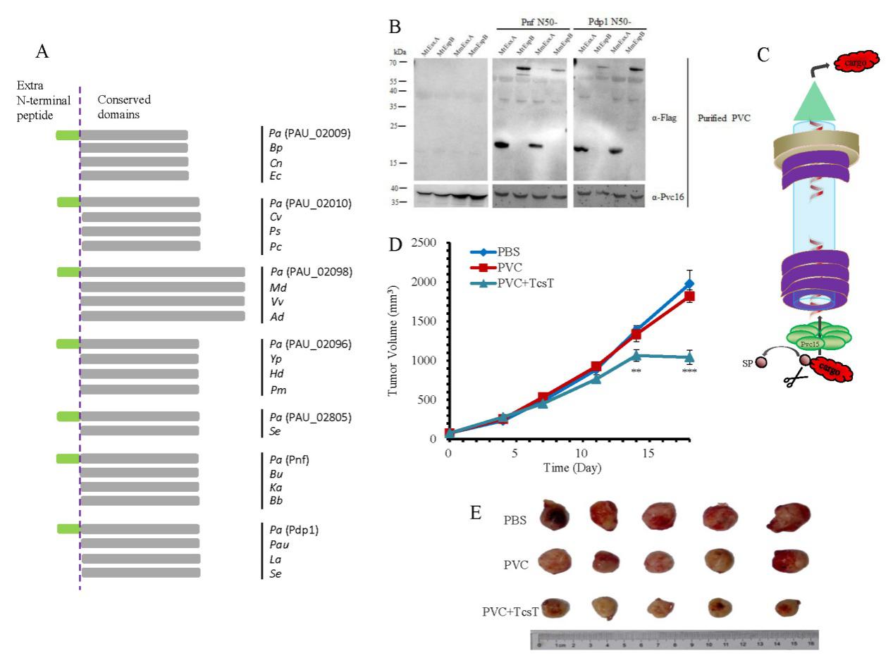 該項工作通過對PVC毒力因子的序列分析發現,一段特異性信號肽編碼在其N端,且在毒力因子裝配入PVC復合物中發揮了關鍵的作用。隨后通過人工設計的方法,成功將包括結核分枝桿菌七型分泌系統T7SS毒力因子在內的多個原核及真核來源蛋白裝載入PVC復合物內筒中,并遞送至真核細胞中發揮其生理功能。研究工作還發現,pvc基因簇中的一個ATPase家族蛋白Pvc15能識別上述N端信號肽并協助裝載蛋白的轉運。最后通過裝載一類細胞致死因子,該PVC裝置被成功應用于荷瘤小鼠的精準治療實驗,顯著抑制了小鼠體內腫瘤細胞的生長。該研究不僅鑒定了一類N端信號肽的作用機理,揭示了它們在PVC復合物蛋白裝載過程中的關鍵功能,還成功將此裝置應用于精準腫瘤靶向治療的研究。這些工作為后續深入改造PVC相關結構為高效的藥物遞送系統奠定了堅實的基礎。