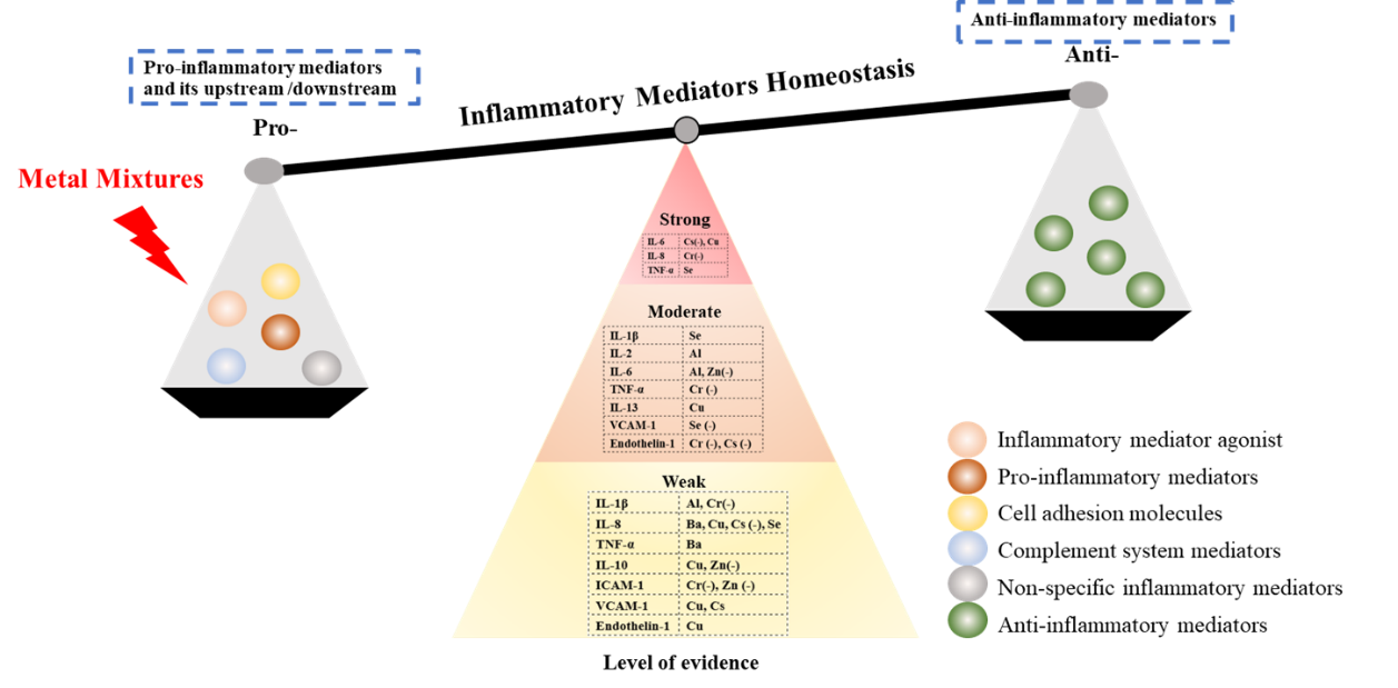 重金屬和類金屬是自然界中廣泛且持久存在的物質,可以通過吸入、攝入或皮膚吸收進入人體。鉛、鎘和砷等金屬污染物的毒理學特性和對人類健康的潛在有害影響,引起了廣泛的關注。研究已表明多種金屬暴露可能與高血壓、糖穩態失調及血脂異常有關。此外,炎癥因子如白介素、超敏C反應蛋白和補體C3等,已被證明參與上述疾病的致病通路。然而,重金屬暴露對機體炎癥通路的影響研究證據不足。此外,在真實世界暴露場景下,人體同時暴露于多種金屬元素,而現有研究僅關注單一金屬的健康效應。因此,在真實世界暴露場景下,重金屬復合暴露是否會對機體炎癥通路產生影響,其單一和復合效應如何?