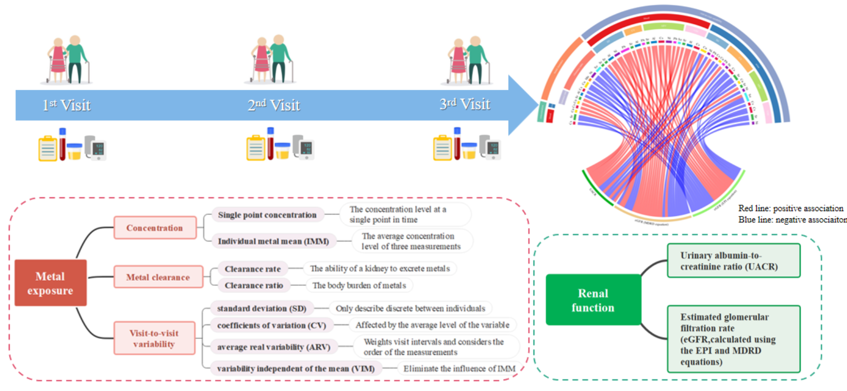 本研究首次提出了金屬清除水平和金屬訪次間變異性指標,并發現這些新指標與腎功能下降相關。同時,揭示了真實世界暴露下,重金屬混合暴露的健康效應。本研究有助于加深對重金屬復合暴露所致慢性疾病的潛在病理生理學機制的理解,為國家環境重金屬監測、管控、治理政策的制定提供科學依據。
