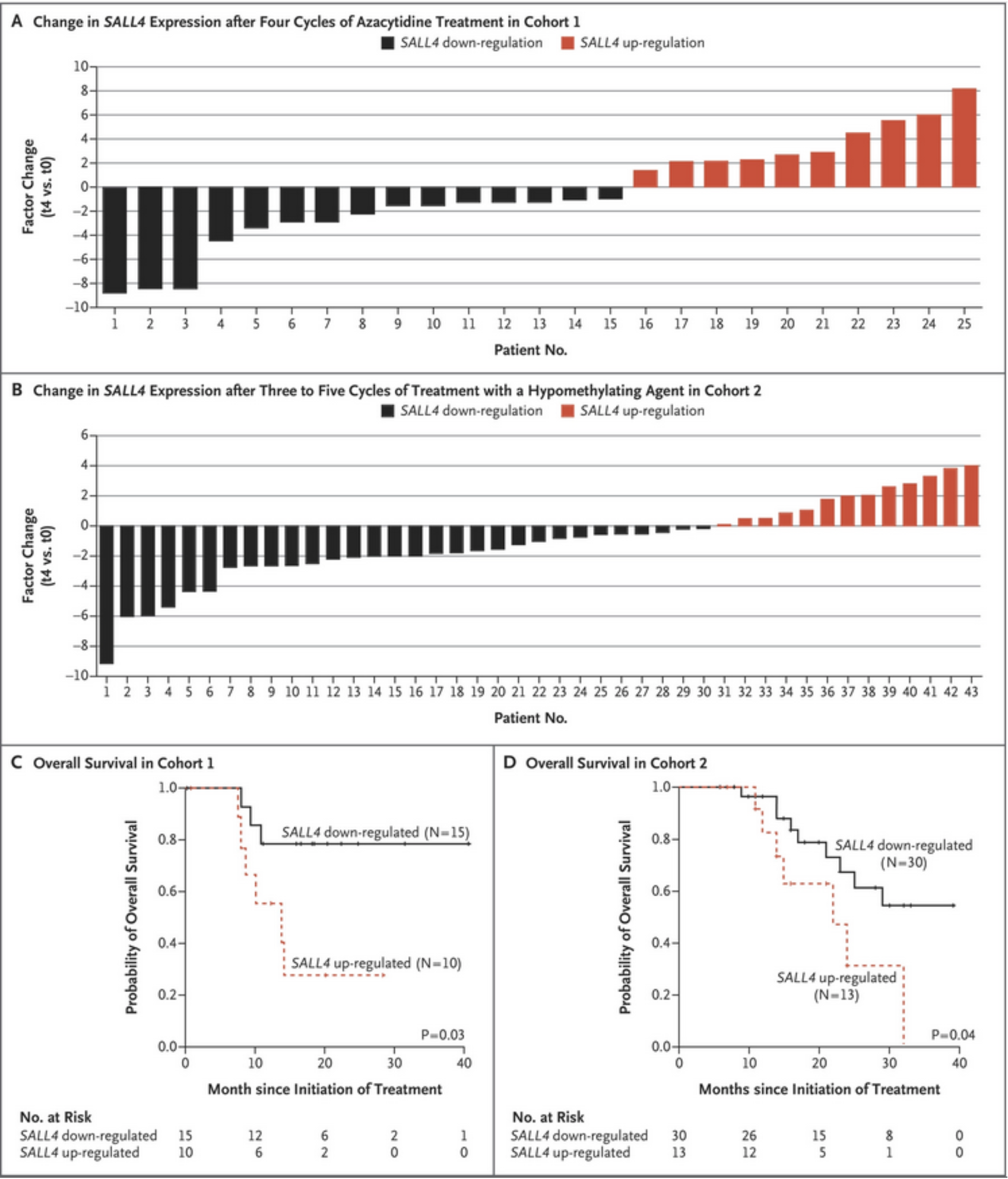 去甲基化藥物地西他濱和阿扎胞苷現(xiàn)已被推薦為較高危骨髓增生異常綜合征的一線治療,但迄今對去甲基化藥物治療骨髓增生異常綜合征的機制及療效影響因素尚知之甚少。對于去甲基化藥物是否通過去甲基化激活并上調(diào)癌基因表達從而影響療效這一科學(xué)假說,本研究團隊選取了在轉(zhuǎn)基因小鼠中證實可導(dǎo)致骨髓增生異常綜合征相關(guān)表征的癌基因SALL4作為研究對象,通過分析意大利Vor Vergata大學(xué)和中國醫(yī)學(xué)科學(xué)院血液病醫(yī)院(中國醫(yī)學(xué)科學(xué)院血液學(xué)研究所)2組接受3-4個療程去甲基化藥物治療前后配對標本SALL4基因表達改變,發(fā)現(xiàn)治療后SALL4基因上調(diào)的患者治療總體有效率和總體生存期均顯著低于未上調(diào)患者。采用一種全新的CRISPR–DNMT1-interacting RNA (CRISPR-DiR)方法,用細胞系和患者原代細胞進一步證實SALL4表達上調(diào)是通過去甲基化藥物對SALL4 CpG島去甲基化后所致。本研究首次證實去甲基化藥物可激活并上調(diào)癌基因表達從而影響藥物的近期和遠期療效,并提示SALL4可能是骨髓增生異常綜合征的一個新的治療分子靶標,去甲基化藥物聯(lián)合其他不同作用機制的藥物有望進一步改善臨床整體療效。