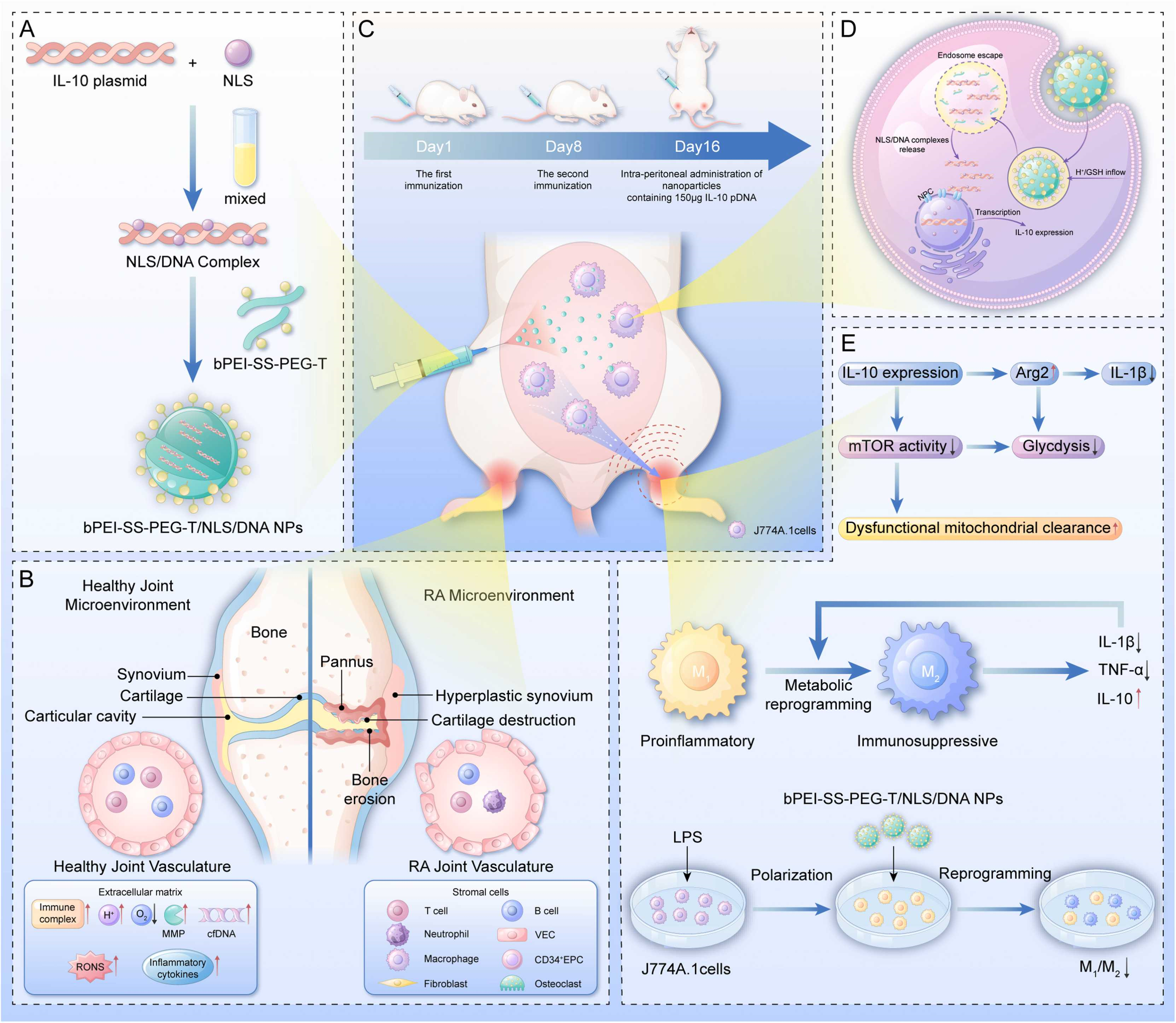 該研究團隊利用巨噬細胞在炎癥部位募集的特性,使用帶有核定位信號(NLS)序列的多肽以及巨噬細胞靶向肽Tuftsin修飾的二硫鍵交聯聚合物(bPEI-SS-PEG-T)構建了一種谷胱甘肽響應性的仿生型白介素10質粒基因納米遞送系統。研究人員首先通過靜電相互作用制備了NLS/DNA復合物以提高質粒的入核效率。研究人員后將NLS/DNA復合物與bPEI-SS-PEG-T結合以構建包載白介素10質粒基因的納米藥物。該基因遞送系統具有生物毒性低、細胞攝取效率高、細胞核靶向性好等優勢,顯著提高了白介素10質粒的轉染效率。此外,由于巨噬細胞具有遷移到炎癥部位的特性,該藥物遞送系統通過腹腔注射,利用巨噬細胞遷移至炎癥部位的特性有效地積聚在類風濕性關節炎炎癥部位,通過誘導巨噬細胞再極化來有效減輕體內炎癥癥狀。該仿生型基因納米遞送系統表現出優異的炎癥靶向能力、較高的入核效率、良好的IL-10質粒基因轉染效率和體內治療效果,有望用于類風濕性關節炎的治療。此外,該遞送系統還從炎癥微環境調節的角度為類風濕關節炎等類似炎癥性疾病的基因治療和基因遞送系統設計提供了新策略。