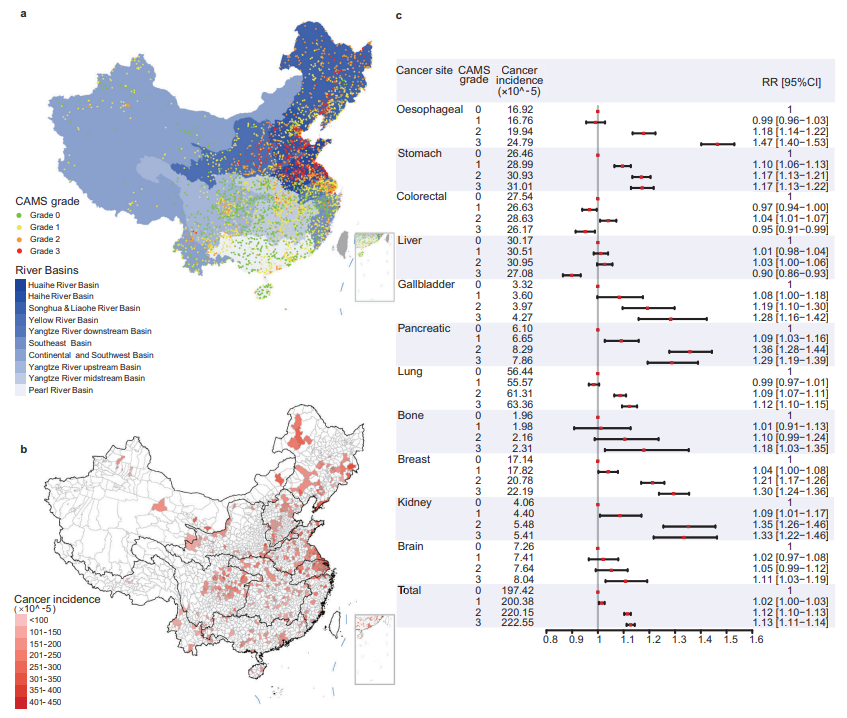 本研究團隊首先提出了一種多污染物空間聚集分析(Cluster Analysis of Multi-pollutants in Space,CAMS)方法框架,形成了創新的地表水質分級體系(簡稱CAMS分級)。CAMS分級綜合21種污染物指標水平、空間位置關系及聚集特征,具備靈活、透明、易解讀性特點,克服了當前分級標準在健康結局關系量化問題上有效性不足的問題。在此基礎上,本研究團隊發現多種癌癥發病率在不同的CAMS水平上存在近似“劑量-反應”關系,癌種涉及消化系統(食管癌、胃癌、膽囊癌、胰腺癌)及其他系統(肺癌、乳腺癌、腎癌、腦癌、骨癌)。地表水污染物的分布差異在一定程度上可以幫助解釋不同流域間的癌癥發病水平差異及癌癥譜構成差異。本文章還對多污染物風險的綜合評估、老齡化的影響等進行了研究。