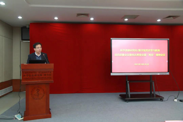 2021年3月26日,醫(yī)學(xué)信息研究所/圖書館(簡稱“所館”)黨委召開黨史學(xué)習(xí)教育動(dòng)員部署會(huì)議暨傳達(dá)貫徹全國“兩會(huì)”精神會(huì)議。院校黨史學(xué)習(xí)教育第一巡回指導(dǎo)組領(lǐng)導(dǎo)到會(huì)指導(dǎo),所館領(lǐng)導(dǎo)班子成員、黨委委員、紀(jì)委委員、中層干部、黨支部委員、黨員代表、民主黨派代表等70余人參加了會(huì)議。
