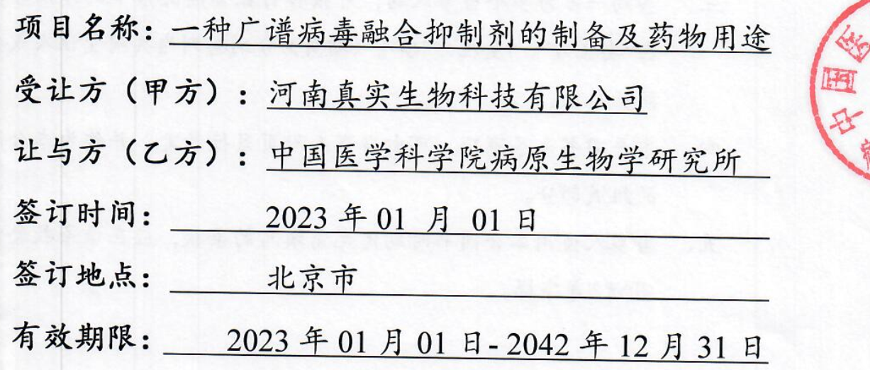 成果簡介:病毒膜融合是眾多病毒感染宿主細胞的關鍵環節,也是極其重要的藥物靶標。病原生物學研究所何玉先團隊針對病毒感染膜融合機制而設計的一種基于多肽的新型病毒融合抑制劑,對多種病毒具有廣譜的抑制作用,體現突出的成藥性優勢。病原生物學研究所將其擁有的“一種廣譜病毒融合抑制劑的制備及藥物用途 ”技術秘密所有權轉讓給河南真實生物科技有限公司,該公司受讓并階段性支付相應的技術秘密轉讓費總額為:人民幣100,000,000元(大寫:壹億元整)。
