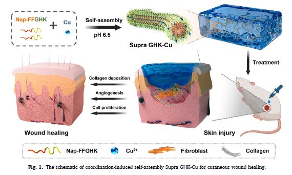 成果簡介:受生命中金屬離子對蛋白質結構和功能的調控的啟發,金屬配位在肽的折疊和組裝中的作用逐漸被研究。然而,構建具有金屬配位和肽自組裝協同作用的生物活性超分子金屬肽仍然具有挑戰性。該研究報道了一種具有天然來源的GHK三肽基序的仿生肽衍生物,加入Cu2+后可以自組裝成超分子金屬肽水凝膠(Supra GHK-Cu)。Cu2+通過橋接兩個肽分子或與一個肽分子相互作用而對Supra GHK具有更強的親和力。由于超分子結構的形成,Supra GHK-Cu對蛋白酶降解具有出色的抵抗力。此外,它通過促進膠原蛋白沉積、血管生成和細胞增殖,比 GHK-Cu 更顯著地加速傷口愈合。這項工作不僅體現了一種成功的仿生超分子金屬肽水凝膠,而且還提供了一種有希望的替代策略來克服傳統生物活性肽在各種生物醫學領域的局限性。