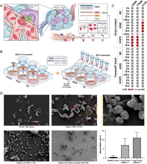 成果簡介:紅細胞的主要功能是運輸氧氣、二氧化碳及其他代謝產物,其在發育成熟過程中會將細胞核和線粒體排出。成熟紅細胞中是否含有DNA片段尚缺乏明確的直接證據??紤]到腫瘤細胞早期發展階段會大量招募紅細胞為其生長提供支持,極有可能影響到紅細胞本身并使其成為新的診斷目標。為了證明這一猜想,研究者通過直接接觸和Transwell透膜分隔開等兩種方式構建了體外共培養的系統,并且在不同時間點重新收集分離紅細胞。結果表明在短暫的直接接觸之后,紅細胞即獲得了對應細胞系的突變DNA片段,而非直接接觸組則不會。之后,研究團隊嘗試在早期肺癌患者的紅細胞中檢測EGFR、KRAS等最常見的突變位點,并與手術切除的腫瘤組織進行比較。結果表明,利用紅細胞的DNA進行突變的檢測具有極高的靈敏性和包容性。該研究首次證實了人類成熟紅細胞中含有長片段的DNA,提示紅細胞可參與到早期腫瘤的發生發展中,基于紅細胞的新型液體活檢技術在腫瘤早篩和診斷領域具有廣闊的應用前景。