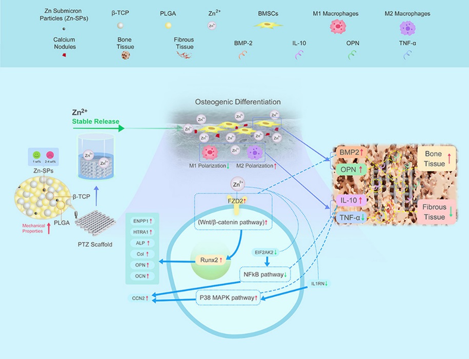 成果簡介:骨缺損的長期不愈合一直是骨科治療中的一個主要問題。人工骨移植材料聚乳酸/β-磷酸三鈣(PLGA/β-TCP)支架,由于其合適的降解率和良好的骨傳導性,有望解決這一問題。然而,機械性能不足、缺乏骨傳導性和植入后的感染問題限制了其大規模臨床應用。近年來,研究人員發現在聚合物中添加鋅(Zn)可獲得優良的機械性能且具有適中的體內降解速率。但鋅離子(Zn2+)在體內的安全問題是亟待解決的。因此,該研究提出利用低溫快速成型3D打印技術將鋅亞微米顆粒添加至PLGA/β-TCP中制備一種新型支架。該技術在改善材料力學性能、仿生骨的結構及穩定釋放離子方面具有一定優勢。該研究發現新型支架可長期釋放的Zn2+具有成骨和抗炎作用,促進骨缺損的修復,再進一步通過蛋白質組學分析技術探討了支架影響成骨分化和炎癥反應的可能機制。該研究不僅為Zn和含Zn聚合物進行骨修復的機制研究奠定了基礎,也為含Zn生物材料的臨床應用奠定了基礎,為臨床治療骨缺損提供了一種新的材料選擇。