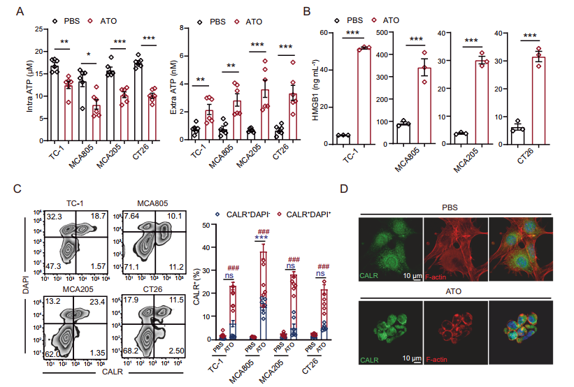 成果簡介:通過多輪藥物篩選,該團隊發現急性早幼粒細胞白血病的一線治療藥物三氧化二砷(ATO)不僅具有廣譜細胞毒性,還能顯著提升腫瘤細胞的免疫原性?;?span style="font-family:'times new roman'">ATO的全細胞腫瘤疫苗能激活CD8+ T細胞,活化I型和II型干擾素信號,高效預防并治療多種實體瘤。ATO可誘導腫瘤細胞氧化應激,激活自噬、凋亡、程序性壞死和鐵死亡等多種細胞死亡通路。其中,程序性壞死和鐵死亡關鍵執行分子Rip3、Mlk和Acs/4對危險信號分子的釋放和抗腫瘤免疫的激活至關重要。針對上述分子缺陷型腫瘤,我們探索出增強腫瘤疫苗療效的聯合治療策略,建立了基于多種砷化合物制備全細胞腫瘤疫苗的技術、質控標準。該腫瘤疫苗與PD-1單抗聯合可獲得協同抑癌效果。上述研究作為封面故事發表于CMI雜志,期刊配發Andreas-Linkermann教授的專題評論(inpress)。