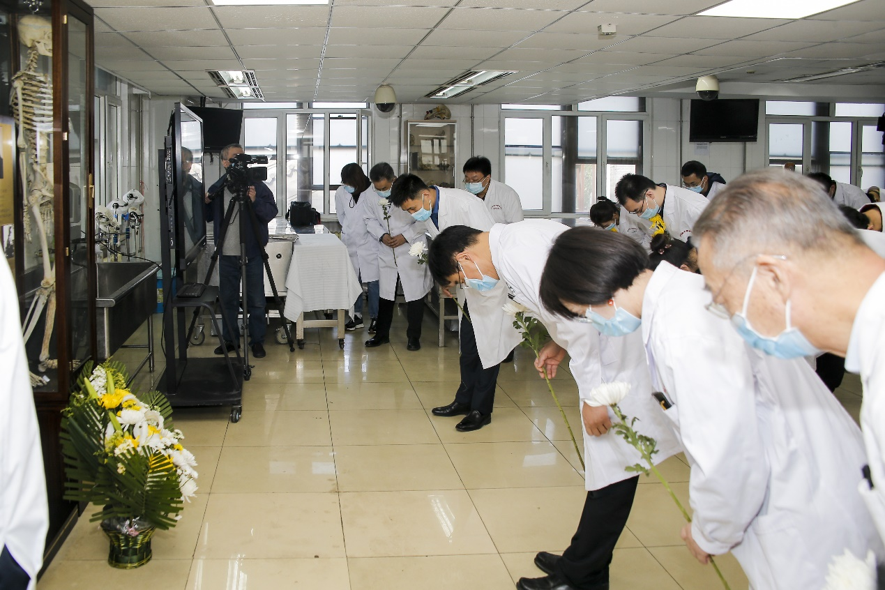 開課儀式是我校人體解剖教學(xué)的老傳統(tǒng)之一。儀式上,校領(lǐng)導(dǎo)和學(xué)院領(lǐng)導(dǎo)為學(xué)生們頒發(fā)了醫(yī)學(xué)生的標(biāo)志——白大衣。師生們現(xiàn)場(chǎng)為大體老師敬獻(xiàn)鮮花,藉此來對(duì)他們?yōu)獒t(yī)學(xué)教育發(fā)展以身相許的奉獻(xiàn)精神表達(dá)崇高敬意。