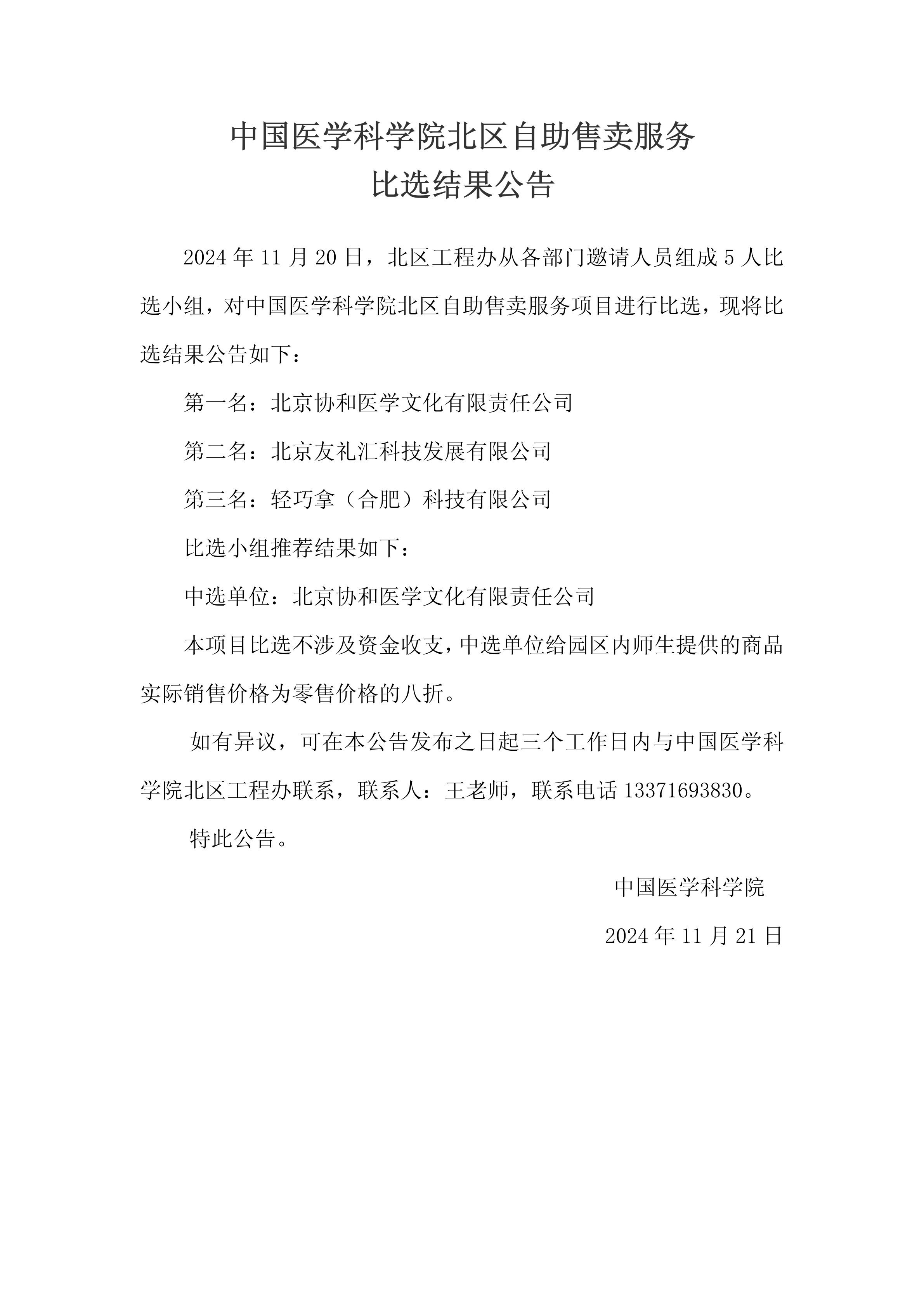 2024年11月20日,北區(qū)工程辦從各部門(mén)邀請(qǐng)人員組成5人比選小組,對(duì)中國(guó)醫(yī)學(xué)科學(xué)院北區(qū)自助售賣(mài)服務(wù)項(xiàng)目進(jìn)行比選,現(xiàn)將比選結(jié)果公告如下: