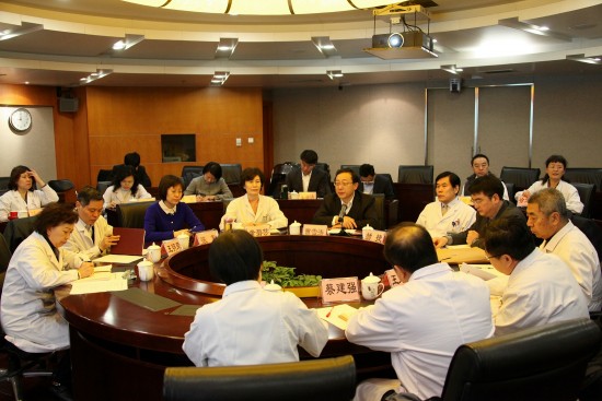 赫捷院長就腫瘤醫院醫教研工作、人才和學科建設、國內外合作交流、 “十三五”規劃以及發展的困難與挑戰等幾方面進行了匯報。隨后,參會院領導分別就國家癌癥中心和腫瘤醫院的協調發展、醫院空間發展的難點、臨床重點專科的扶植、人才引進及培養、住院醫師規范化培訓、人員編制等方面的問題進行了發言。