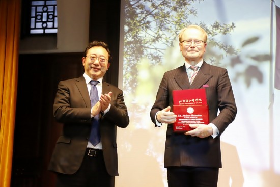 為了表彰Hamsten教授為中國與瑞典醫學合作及心血管疾病研究做出的卓越貢獻,曹雪濤院校長代表院校授予Hamsten教授“北京協和醫學院名譽教授”稱號,并頒發榮譽證書,希望他繼續積極推動中-瑞醫學科學的交流與合作,為世界醫學科學的發展做出貢獻。