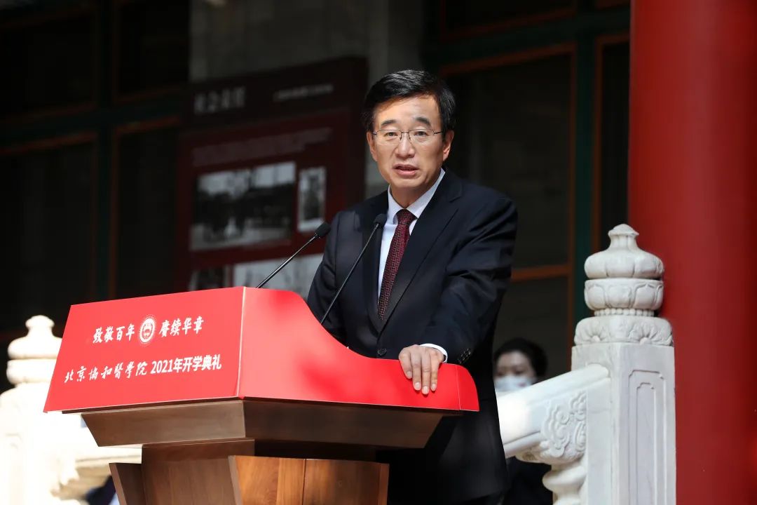 中國醫學科學院院長、學術咨詢委員會學部委員,北京協和醫學院校長王辰院士發表講話。他說,人生有一種重要的經歷叫求學;求學有一個門類叫學醫,醫學盈溢著愛,是堪與廝守終生的學問、職業、使命;學醫有一個地方叫協和,協和與中國醫學科學院院校一體,打造國家醫學科技創新體系的核心基地;協和有其盛名,協和有其突出的優勢,協和更有其需要改進和發展之處,不但協和,你們將來工作的每一個地方都會如此,你們要成為善化體系的促動力量;學習的歷程中,有一個概念叫作“級”,另一個概念叫作“屆”,這“級”和“屆”之間就是你們在校學習的時光。你們是2021級新生已為現實,某某屆畢業生還只是預期,希望你們努力,求學業圓滿,得化繭成蝶。