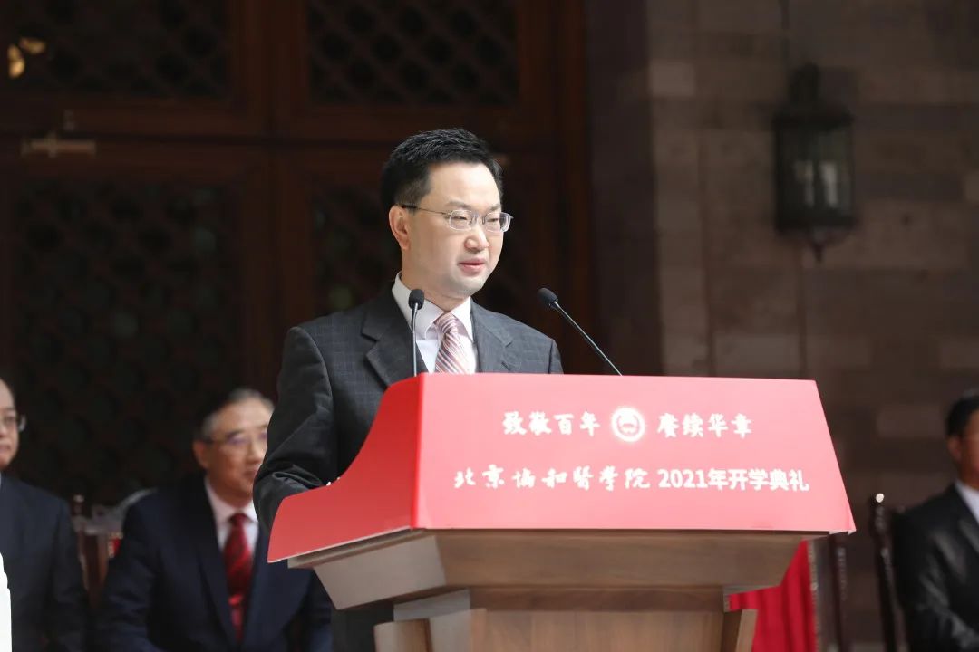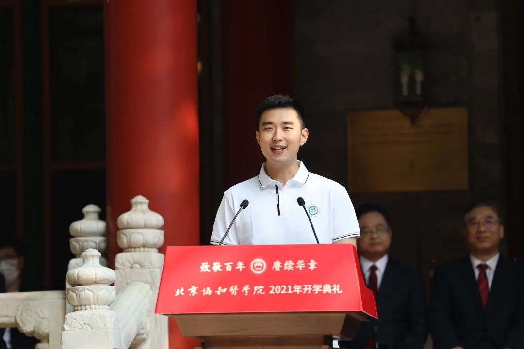 新生代表2021級直博生袁碩發言,號召全體新生作為協和精神的傳承人,將個人醫學夢融入到國家醫學發展的大潮中去,以“除人類之病痛,助健康之完美”為己任,為社會醫藥衛生事業的發展和人類身心健康奮斗終身,不負祖國和人民的殷切期望。
