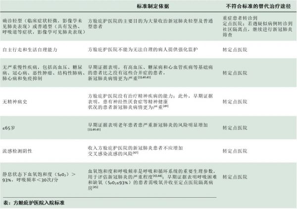 第二個(gè)主要功能是分診。方艙庇護(hù)醫(yī)院為中國的醫(yī)療衛(wèi)生體系增加了一個(gè)額外的醫(yī)療照護(hù)層級,為應(yīng)對新冠肺炎疫情提供了一個(gè)具有戰(zhàn)略性的分診策略。符合入院標(biāo)準(zhǔn)(見下表)[6,46]的輕型和普通型新冠肺炎患者在方艙庇護(hù)醫(yī)院接受隔離和治療,而重癥和危重癥患者則在定點(diǎn)醫(yī)院接受治療。這種戰(zhàn)略性分診功能釋放了定點(diǎn)醫(yī)院的壓力,從而提高了中國應(yīng)對新冠肺炎疫情的效率和效力。方艙庇護(hù)醫(yī)院使武漢市醫(yī)療衛(wèi)生系統(tǒng)得以將重癥和危重癥患者(約占新冠肺炎患者的20%)安排在定點(diǎn)醫(yī)院進(jìn)行治療,同時(shí)確保能為輕型和普通型患者(約占新冠肺炎患者的80%)提供適宜的醫(yī)療照護(hù)[16,33]。