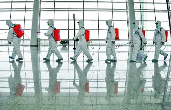 4月3日,湖北省武漢市消防救援支隊消殺隊員對天河國際機(jī)場T3航站樓進(jìn)行封閉式衛(wèi)生防疫消殺工作。新華社發(fā)