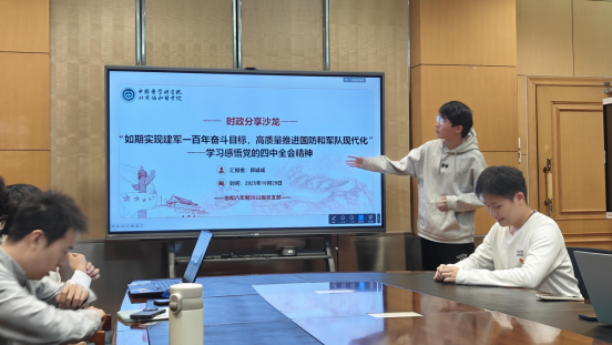 會上,支部書記農張蔚同志帶領全體黨員學習黨的二十屆四中全會公報要點,回顧“十四五”時期取得的重大成就,展望“十五五”時期的發展目標。劉俊希、郭誠成兩位同志分別圍繞“推進祖國統一大業”和“高質量推進國防和軍隊現代化”作主題發言,并與黨員同志們就相關問題展開熱烈討論。大家一致認為,在復雜嚴峻的國內外形勢下,展示軍隊現代化水平是維持和平、反對侵略的有力方式,祖國的統一大業必定在兩岸同胞的共同努力下得到實現。