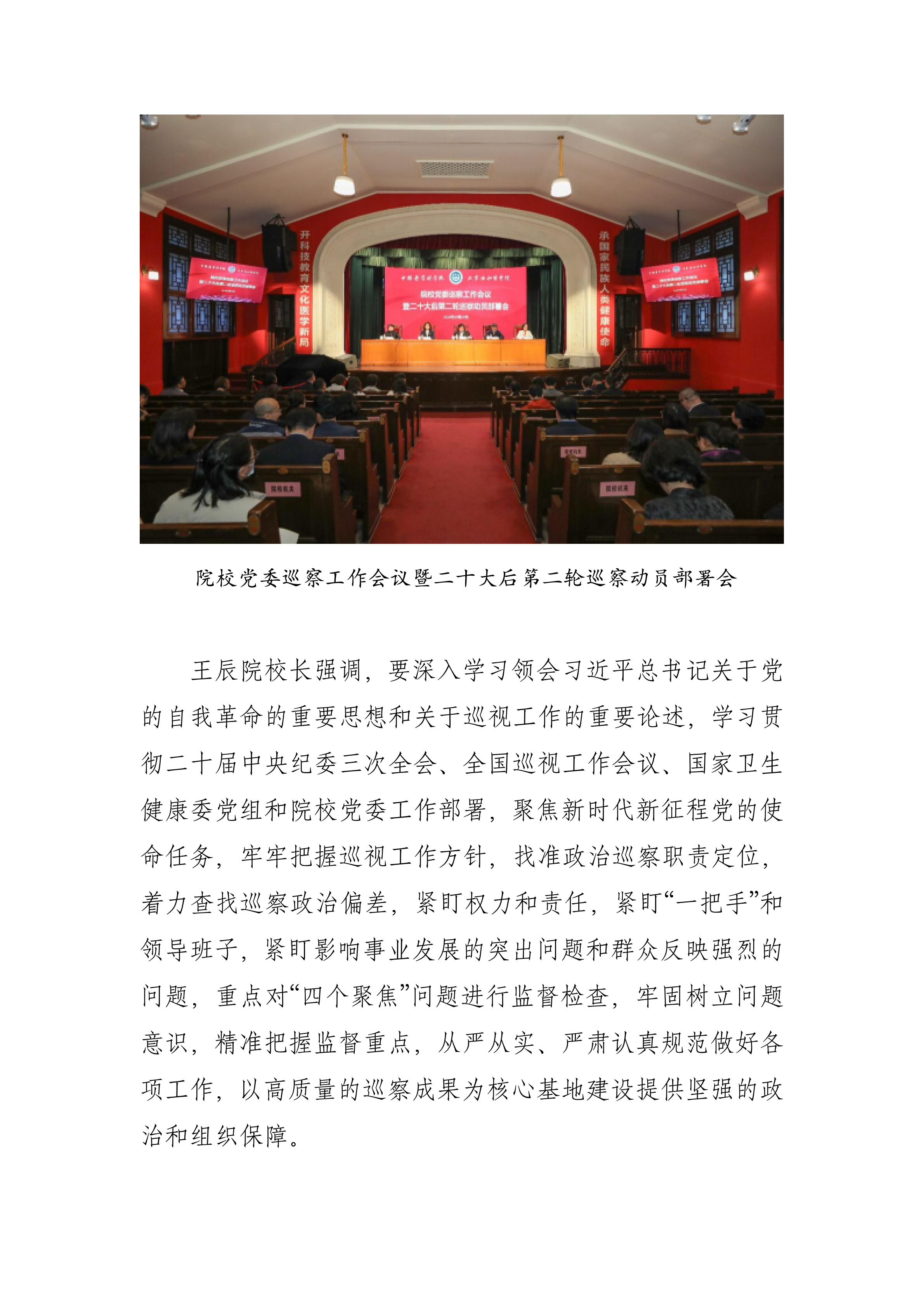 王辰院校長強調,要深入學習領會習近平總書記關于黨的自我革命的重要思想和關于巡視工作的重要論述,學習貫徹二十屆中央紀委三次全會、全國巡視工作會議、國家衛生健康委黨組和院校黨委工作部署,聚焦新時代新征程黨的使命任務,牢牢把握巡視工作方針,找準政治巡察職責定位,著力查找巡察政治偏差,緊盯權力和責任,緊盯“一把手”和領導班子,緊盯影響事業發展的突出問題和群眾反映強烈的問題,重點對“四個聚焦”問題進行監督檢查,牢固樹立問題意識,精準把握監督重點,從嚴從實、嚴肅認真規范做好各項工作,以高質量的巡察成果為核心基地建設提供堅強的政治和組織保障。