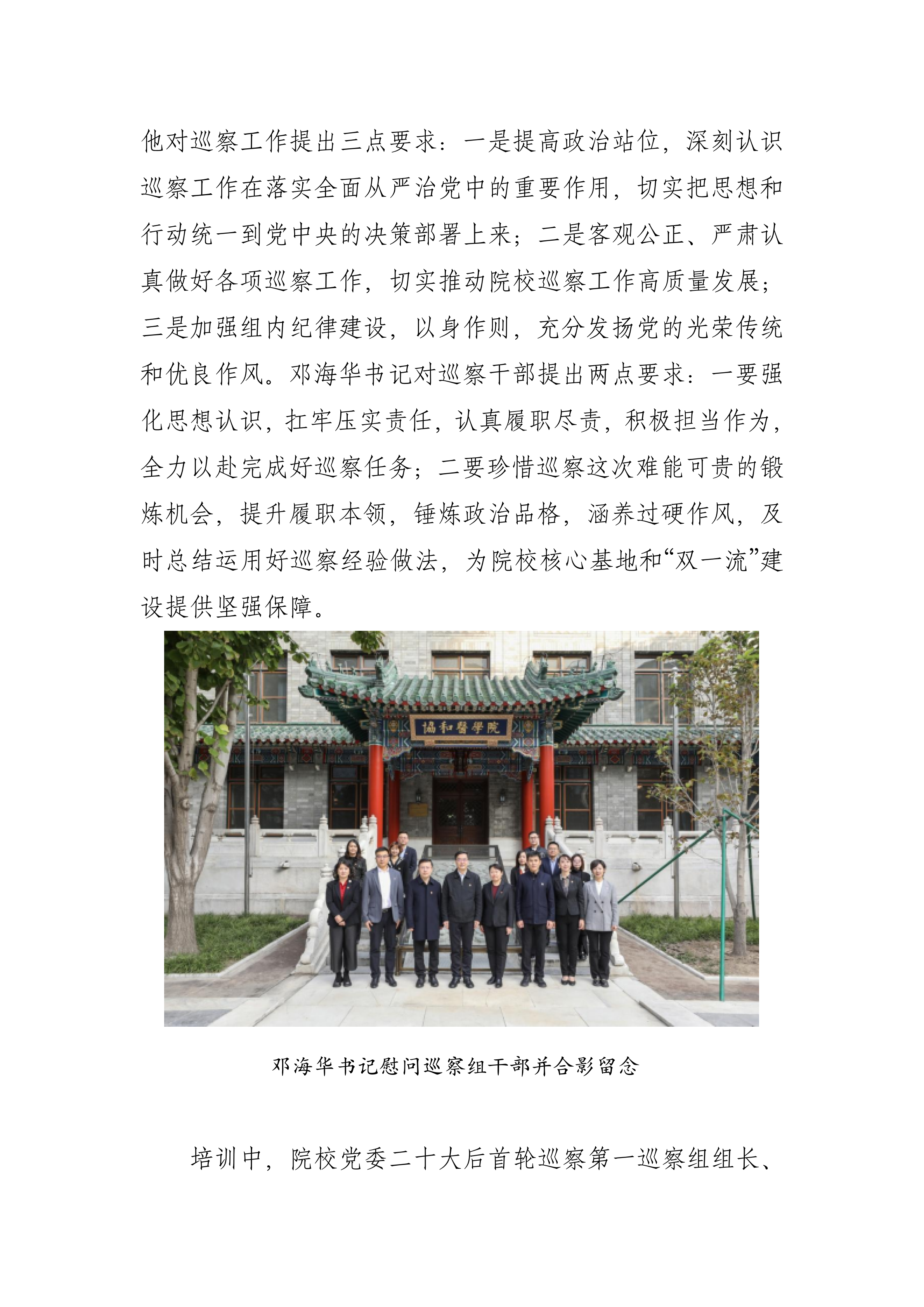 鄧海華書記指出,院校黨委巡察是一項嚴肅的政治任務。他對巡察工作提出三點要求:一是提高政治站位,深刻認識巡察工作在落實全面從嚴治黨中的重要作用,切實把思想和行動統一到黨中央的決策部署上來;二是客觀公正、嚴肅認真做好各項巡察工作,切實推動院校巡察工作高質量發展;三是加強組內紀律建設,以身作則,充分發揚黨的光榮傳統和優良作風。鄧海華書記對巡察干部提出兩點要求:一要強化思想認識,扛牢壓實責任,認真履職盡責,積極擔當作為,全力以赴完成好巡察任務;二要珍惜巡察這次難能可貴的鍛煉機會,提升履職本領,錘煉政治品格,涵養過硬作風,及時總結運用好巡察經驗做法,為院校核心基地和“雙一流”建設提供堅強保障。