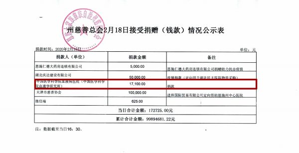 院所有三百余位離退休人員,他們退休前大多從事醫療、科研相關工作。在嚴格落實居家防護的同時,疫情的進展也時刻牽動著老同志們的心,他們紛紛用自己的方式為戰“疫”做著努力。87歲的退休黨員褚建新教授得知院所征集疫情防控藥物研發的意見建議時,主動聯系院所有關部門將自己對抑制病毒的科研思路和設想寫成文字上報給醫科院;退休職工、九三學社第14屆中央促進技術創新工作委員會方健委員,在前期已經捐款5800元之后,又向天津市定點援助的湖北恩施的鶴峰縣防疫指揮部捐款10000元。早在2月,院所幾位離退休支部書記就找到離退休工作處,表達為疫情防控捐款的想法。在離退休工作處同志們的努力下,四個支部17200元捐款按照離退休黨員們的意愿,匯到了湖北恩施土家族苗族自治州慈善總會。他們說,黨中央把援助恩施的任務分配給了天津,我們也把自己對恩施人民的一份心意送過去。