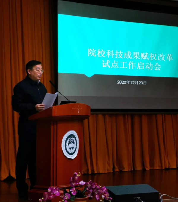 12月23日下午,院校 “賦予科研人員職務科技成果所有權或長期使用權試點工作”啟動會在新教學科研樓八樓報告廳召開。