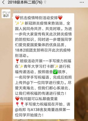 18本2班的學(xué)生作為協(xié)和護(hù)理學(xué)院的一份子,雖不能沖鋒一線與前輩們并肩作戰(zhàn),但也在用自己的方式全力支持國(guó)家的號(hào)召,在積極完成線上學(xué)習(xí)的同時(shí),也進(jìn)行了多項(xiàng)為武漢加油的班級(jí)活動(dòng)。